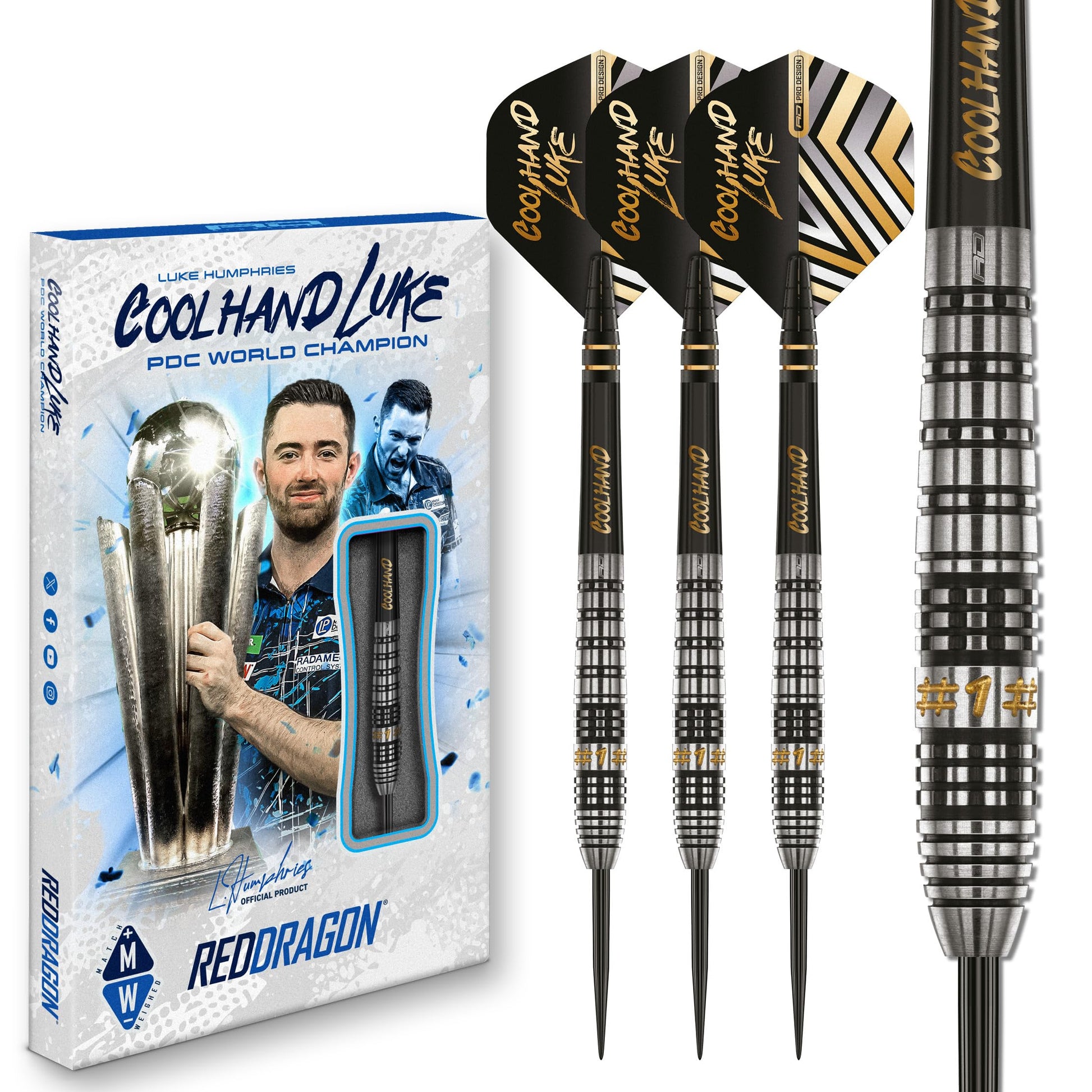 RED DRAGON Darts – Professional Player Luke Humphries Coolhand Prestige Series - 90% Tungsten Darts Set with Dart Flights & Dart Shafts (Stems) - Available in Soft Tip 18g & Steel Tip 22g, 23g & 24g